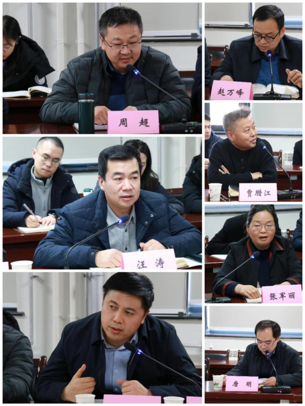 与会的8位教师代表先后发言。赵万峰老师结合自己的课程实践谈了党的二十大精神融入课程教学的具体思路与做法。贾腊江老师从健康中国和绿色中国的角度,谈了课程融入的路径。唐明老师通过多个指标和主题主线,论证了宣讲内容的科学性和方法的重要性。周超老师结合自己的工作经历,谈了如何进行课程融入的三点感受,并建议“每学期做个问卷调查”以更好地了解学情和增强教学的针对性。张军丽老师则着重谈了怎样做好国情、校情与院情的统一,并就课程如何培养学生的家国情怀等内容谈了自己的认识。汪涛老师从处理好课程的基本性质与专兼职教师的特殊性二者之间的关系入手,认为课程融入,除了强调理论的专业性和系统性,还有实践的普及性和实证性等问题。崔延力老师结合自己脱贫攻坚的专题教学实践,对高质量发展如何融入课程教学谈了自己的认识。