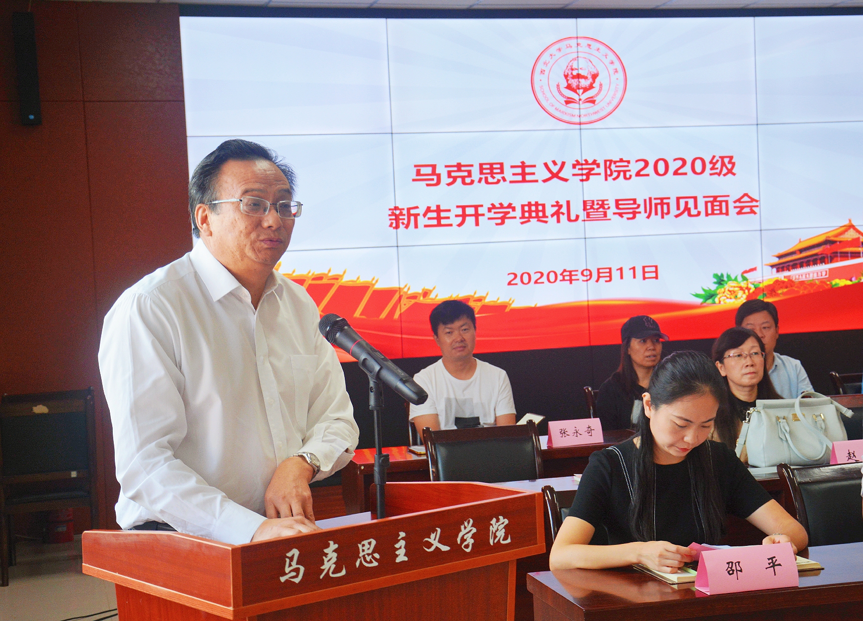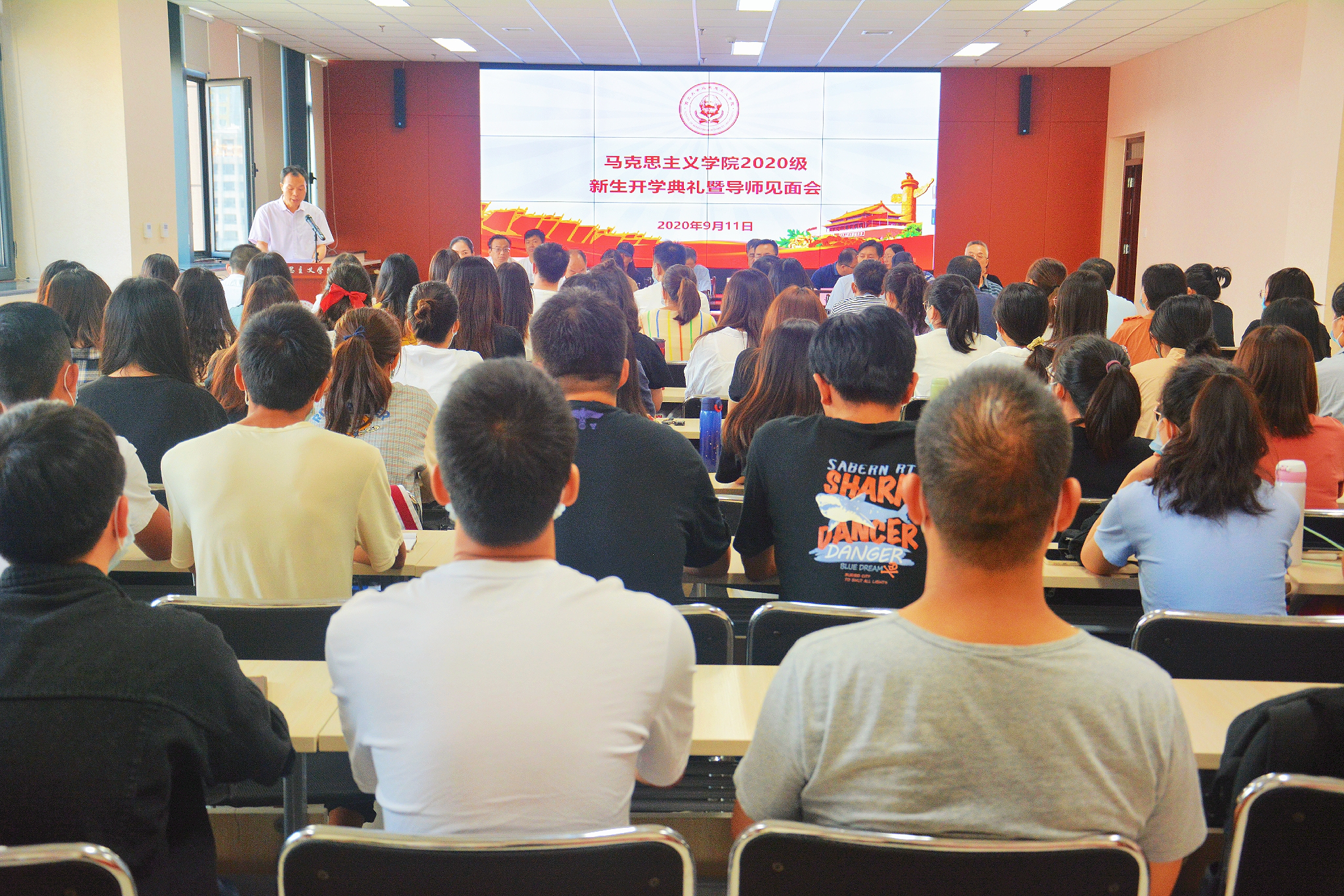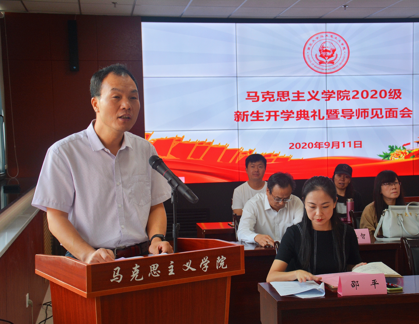 2020年9月11日上午,马克思主义学院2020级新生开学典礼暨导师见面会在学院学术报告厅隆重举行。出席典礼的领导和嘉宾有西北大学党委副书记、马克思主义学院院长吕建荣,马克思主义学院党委书记刘杰、学院常务副院长王强、学院副院长李志松、学院副院长李宪清、学院团委书记刘建波、辅导员刘娟,马克思主义学院硕、博士生导师,以及2020级全体新生。典礼由学院党委副书记邵平主持。