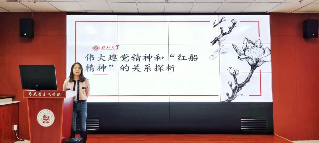 王璐根据自己最近的学习成果和时代热点,以《伟大建党精神和“红船精神”的关系探析》为题进行分享。她从精神内涵、生成逻辑、现实意义三个维度对建党精神和红船精神的关系进行了详细的说明,鼓励同学们从建党精神中汲取宝贵经验和力量,在新时代接续奋斗。