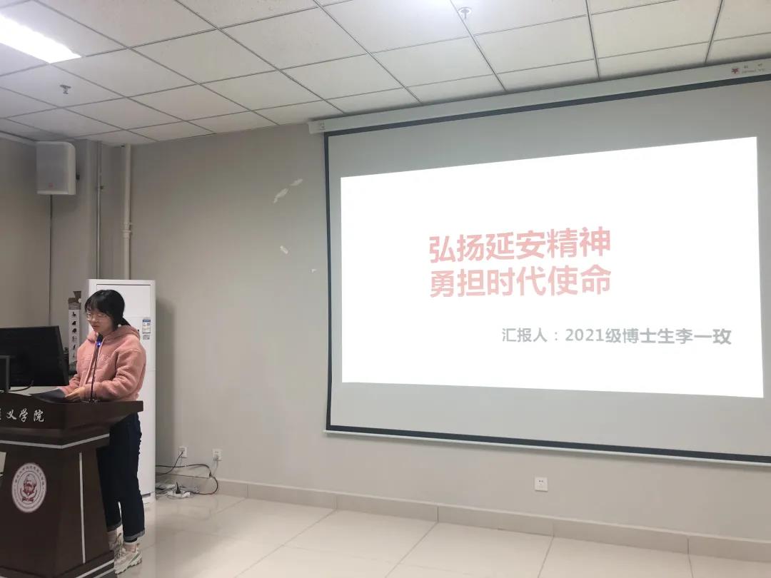 李一玫同学以《弘扬延安精神,勇担时代使命》为主题,深入阐述了延安精神的内涵、灵魂和精髓,同时就新时代如何传承和发扬好延安精神展开深入探讨,强调我们作为青年学子,要不断从延安精神中坚定政治信仰、汲取前进力量。