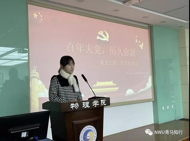 惠靖童以《百年大党,历久弥新——党史上的三次历史决议》为主题,通过对三个历史决议的主要内容和历史意义进行简要梳理,引导同学们用横向比较的思维方法,明白其中的“变”与“不变”。最后,她号召同学们,站在新的征程上,必须要增强四个意识、坚定四个自信、坚决做到两个维护,团结一致向前进。