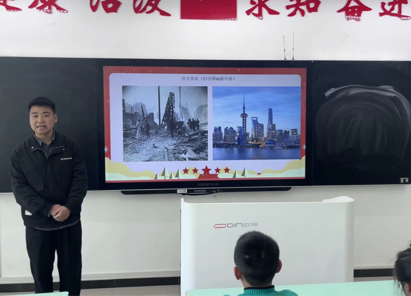 邓喆以《新时代新征程》为题,向同学们阐述“新时代”的含义以及“两个一百年”奋斗目标的内容,并带领同学们观看有关我国在新时代取得的重大成就的短片,以此鼓励大家树立远大理想,为建设强国之路努力奋斗。