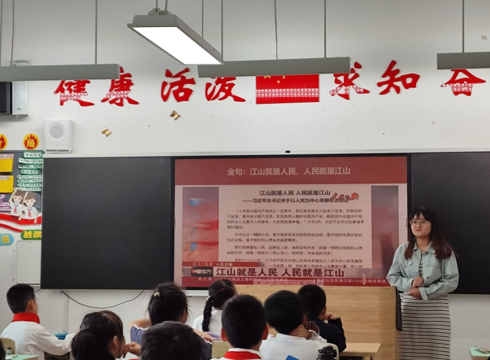 冯金香以《习近平爷爷心系人民群众》为题,通过展示《人民就是江山,江山就是人民》的视频,讲述习近平总书记深入人民群众的故事,让同学们感受到习近平总书记的人民情怀。