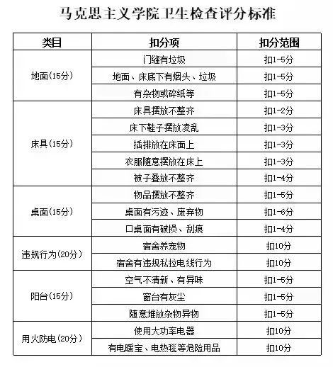 2月26日下午,我院开展宿舍卫生安全检查工作,检查标准如下: