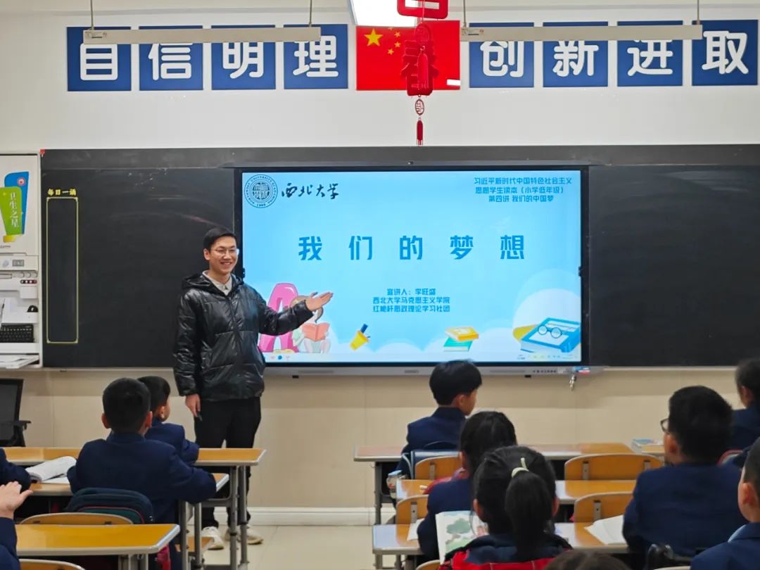 3月14日,我院红桅杆思政理论学习社团在西安航天城第六小学,以《习近平新时代中国特色社会主义思想学生读本》(小学低年级)为主要内容,为二年级的小学生讲授思政课。主讲人分别是来自2023级和2024级思想政治教育与中国近现代史基本问题研究专业的6名硕士研究生。