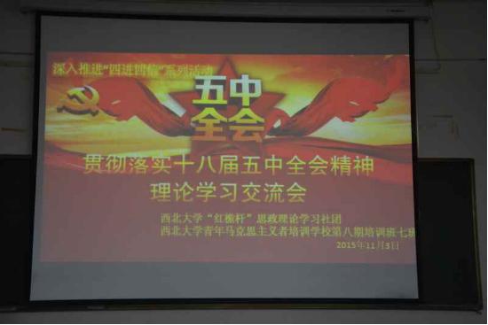 为了及时、系统、全面地学习和贯彻落实党的十八届五中全会精神,西北大学青年马克思主义者培训学校第八期培训班七班和西北大学“红桅杆”思政理论学习社团于2015年11月3日在西北大学南校区5214共同举办了“贯彻落实十八届五中全会精神”理论学习交流会。班主任李鑫老师出席交流会,全体七班成员参加此次交流会。此次交流会由七班班长黄翌主讲。