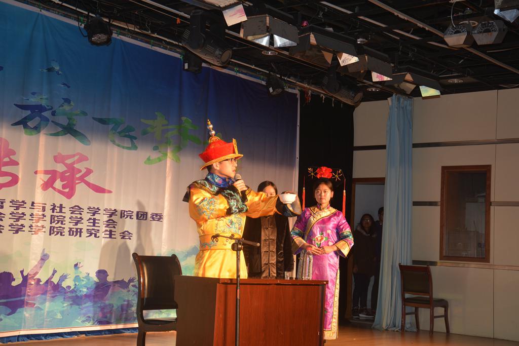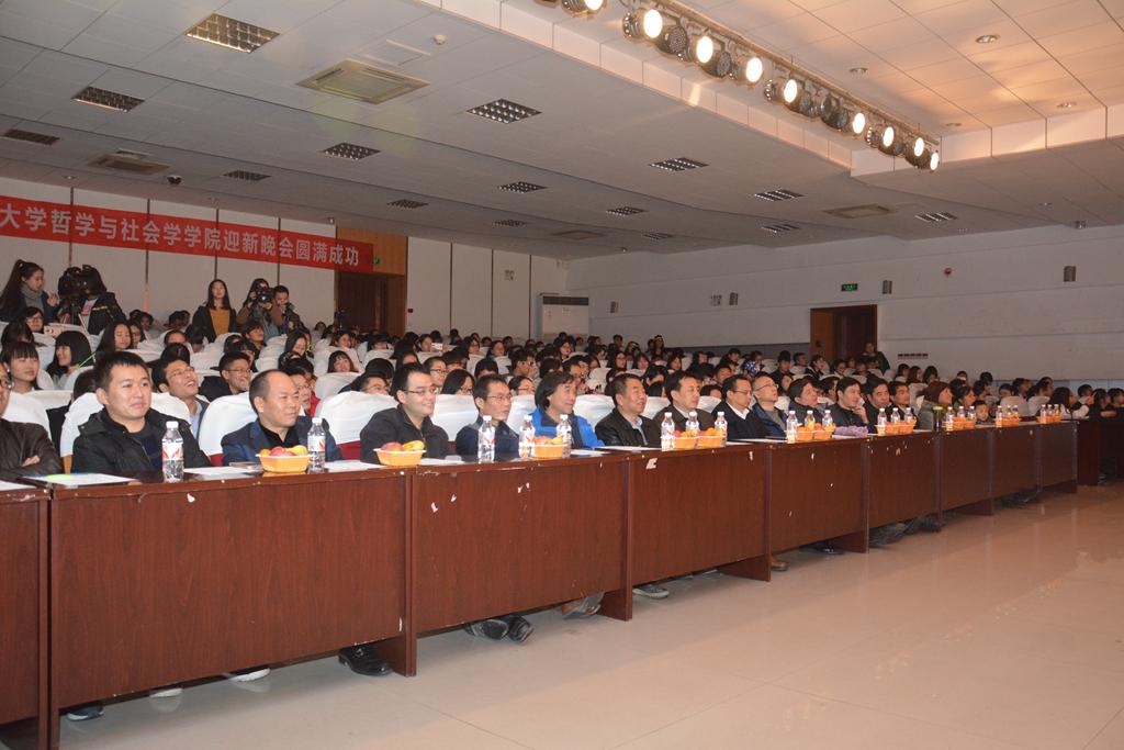 桃李芬芳,硕果累累,金秋时节我们哲社院再一次迎来新的同学们,他们满含朝气,他们满怀希望!为了拉近与新生的距离,表达我院对学生的热烈欢迎,为了让新生尽情展示他们的风采,经过一个多月的精心准备,11月17号晚7点,我院在长安报告厅隆重举行了以“爱·传承”为主题的迎新晚会。出席晚会的领导嘉宾有:院党委书记马朝琦老师,院长杨洪老师,副院长王永智老师,副院长王强老师,副院长李宪清老师,院党委副书记李波老师,研究生院王海波老师,社会工作系主任魏哲铭老师。另外出席晚会的嘉宾还有李健森老师,胡军良老师,苟昭赟老师,陈中奇老师,王元琪老师,李志松老师,马新宇老师,郭振华老师,马新锋老师,袁志伟老师,孙明哲老师,齐钊老师,袁成老师,团委书记刘建波老师,辅导员李鑫老师。此外还邀请了校学生会代表、各院系代表、各社团代表等嘉宾前来观看晚会,我院全体学生观看了此次晚会,场下座无虚席。