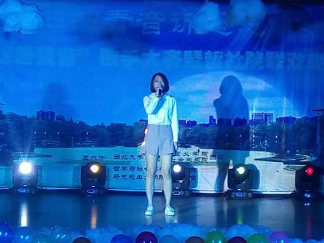 张煜同学作为第一个出场的比赛歌手,一身红裙,伴随着天竺少女的音乐舞动,嗓音清澈婉转,舞姿优雅多情,引得在场的观众们一阵阵的掌声。
