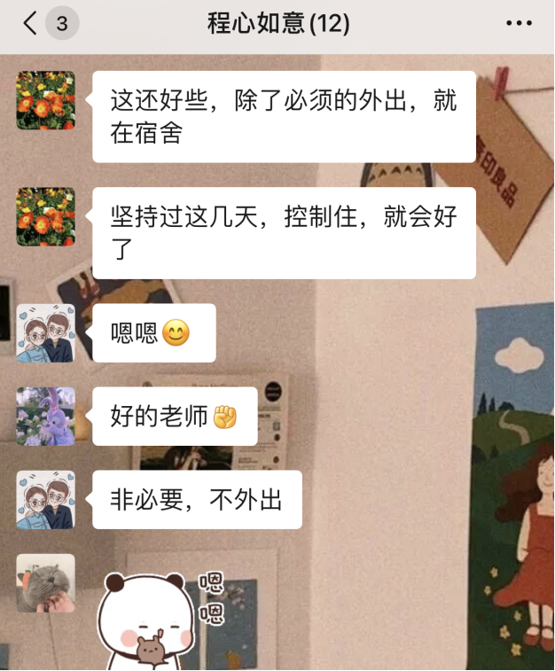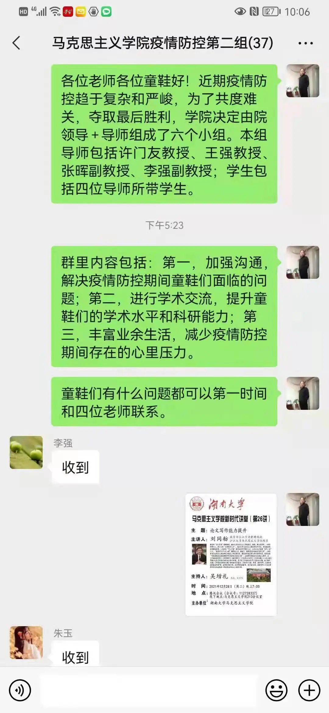 二是抓好导师队伍,导师全面参与学生疫情防控管理。院党委要求全体博、硕导切实负起责任,全面参与、积极配合学院做到学生管理“不漏一人”。学院将全体学生分为6组,由6名院领导带队和导师各负责一组,每个组的工作任务为:一是及时传达各级疫情防控工作要求;二是做好学生思想教育工作,引导学生以积极心态应对疫情,合理安排学习生活;三是结合教学科研要求,每周至少开展一次形式灵活的线上活动;四是了解学生实际困难和需求,及时协调、解决。做到及时关心慰问学生,及时掌握学生思想状况,让学生真切感受到来自学院和导师的关爱和温暖。