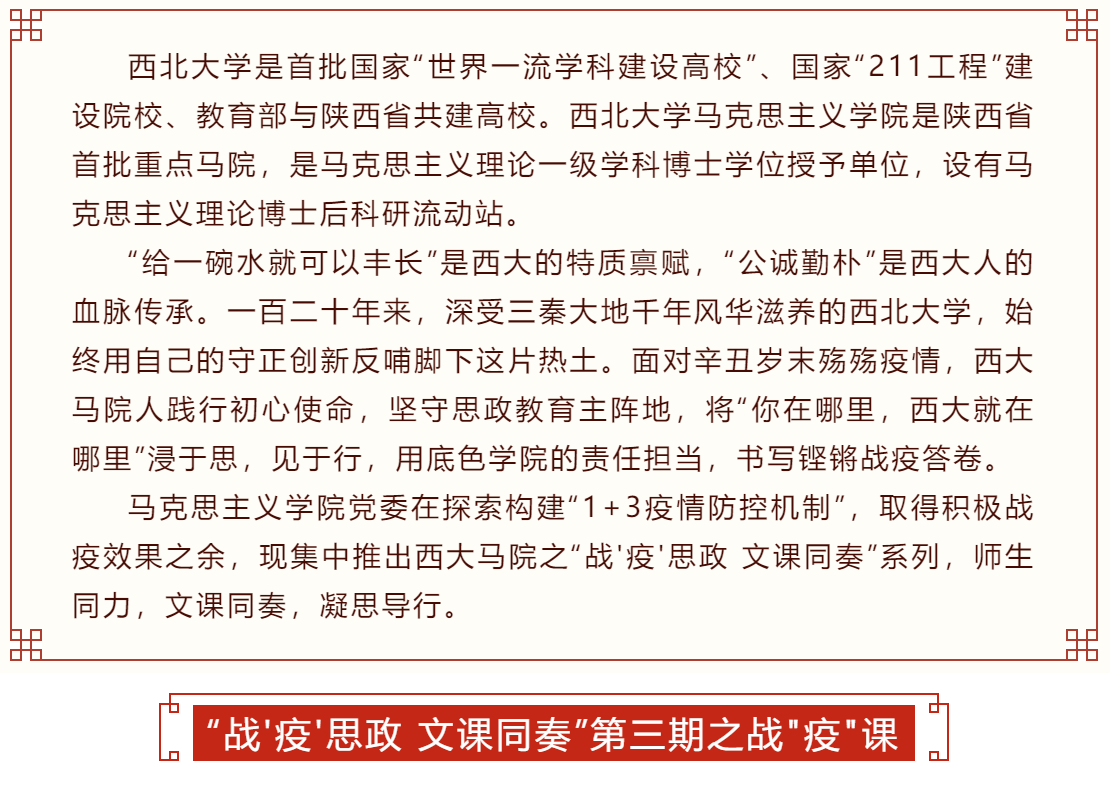 上一条:武汉大学骆郁廷教授做客“终南思政讲坛” 下一条:西大马院:战疫思政 文课同奏 第二期