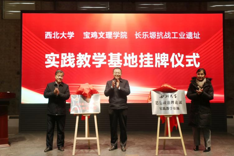 16日上午,西北大学与宝鸡文理学院共建的思想政治理论课实践教学基地在宝鸡市长乐塬抗战工业遗址揭牌。我校党委副书记张清,宝鸡文理学院副校长王富平,宝鸡市金台区区委常委、宣传部部长李科峰等出席仪式,我院党政领导班子成员,宝鸡文理学院马克思主义学院党政主要负责人,以及两院教师代表参加。仪式由宝鸡市长乐塬管委会主任王敏主持。
